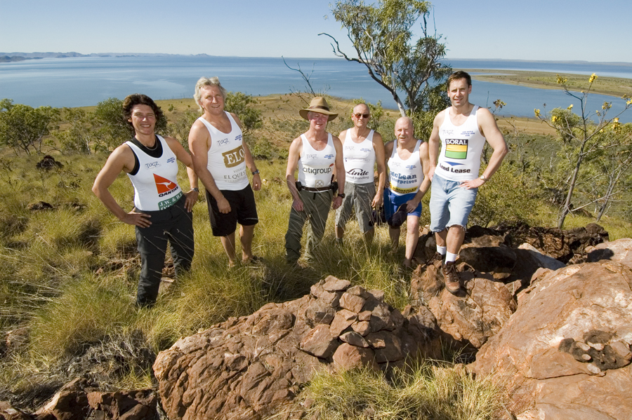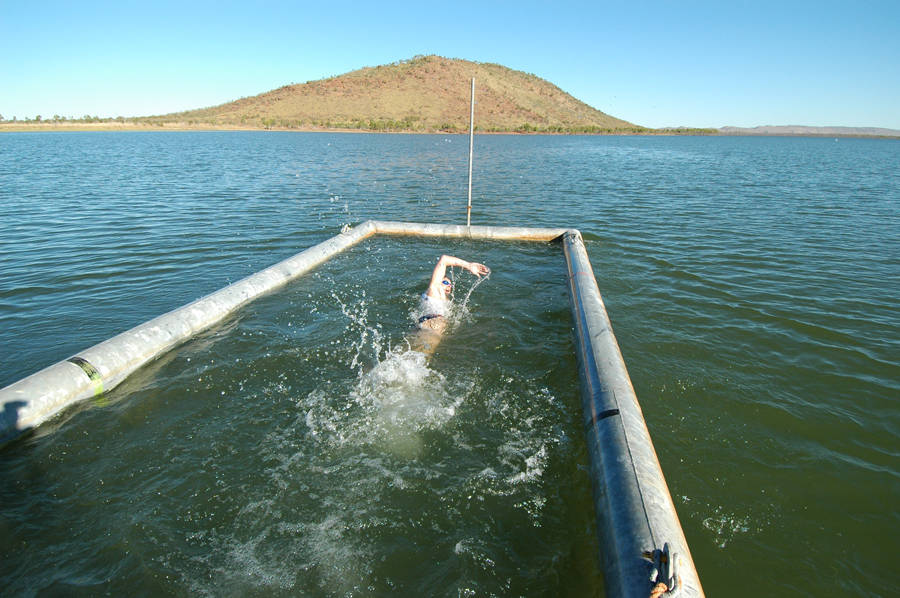 The first thing the team did when they arrived at Lake Argyle after the long flight from Sydney was to take a look at the start and the planned course. They were ferried to Flying Fox Knoll at the southern edge of the lake by the obliging local David Crock. Looking down the course that followed the old Ord River, everyone realised what a huge body of water Lake Argyle is. It was a bit daunting. Every member of the team had completed many swims, but none in a vast inland lake.