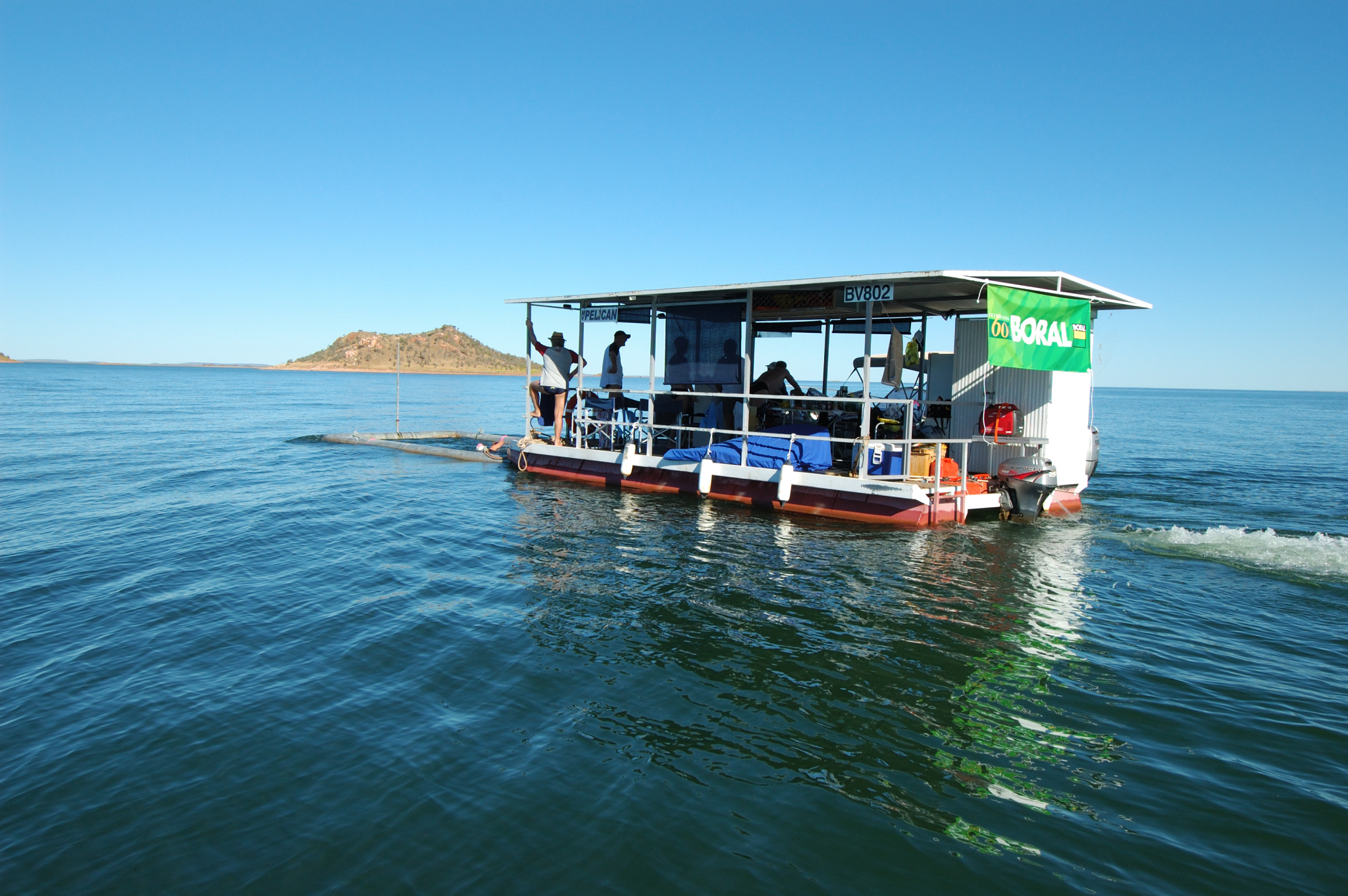 Friday June 23, 2006, arrived. The team was once more ferried to the southern end of the lake in David Crock’s fast ski boat. The catamaran barge, with Jim Hughes at the helm and the shark cage attached, was already waiting. It had been driven down the previous day by Steve Farquhar and Jim. The barge, affectionately known as The Pelican would be a floating swimming platform for the next three days. Everyone transferred to the barge and prepared to start the ground-breaking swim.