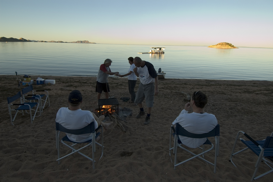 The locals hosted the swimmers and boat drivers to a barbecue at the boat ramp. Everyone was tired after 21⁄2 days swimming in the hot sun.