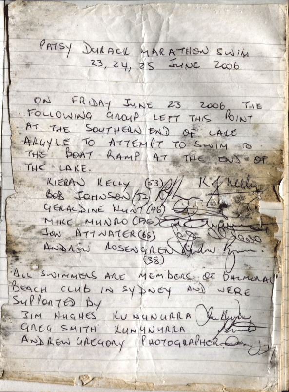 Without local help from Jim Hughes, Steve Farquhar, David Crock, Doug Grandison, Kimberly Industries and McLean Enterprises, who donated the boat and crocodile cage, the swim was not possible. Neither the swimmers nor the Balmoral Beach Club benefited financially from the Patsy Durack Memorial Marathon Swim. The swimmers met all their own costs. Without the support of the Kununurra community the event would not have been possible.
